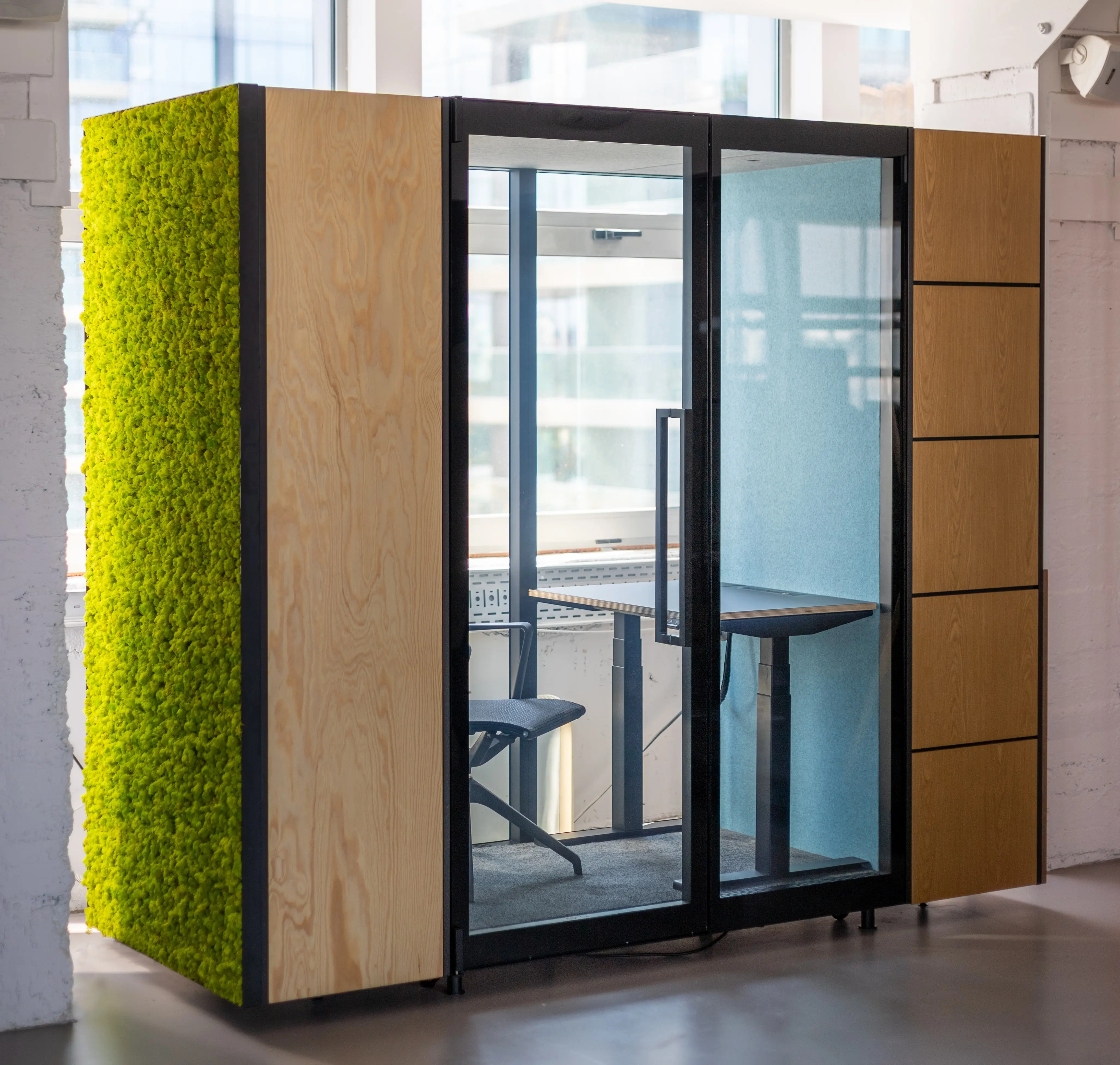 Ett rymligt och modulärt mötesrum utformat för sex eller fler personer. Perfekt för teammöten, workshops eller samarbeten som kräver fokus. Här får ni en privat och tyst miljö där samtalen hålls inom rummet – utan att störa resten av kontoret.